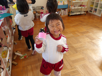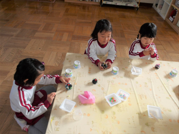 ばら組のこどもたちは、マツボックリでミニミニツリーをつくりました。