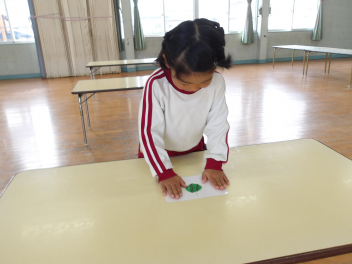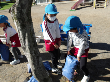 幼稚園に帰る途中、小学校に咲いているサザンカの花が散っていたので、その花びらを拾って帰りました。