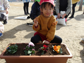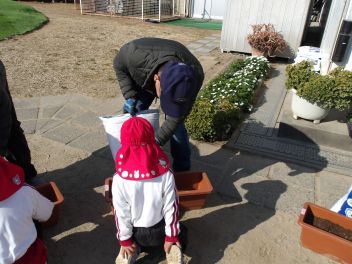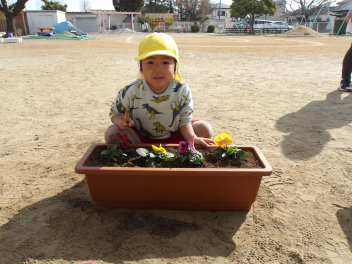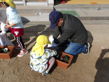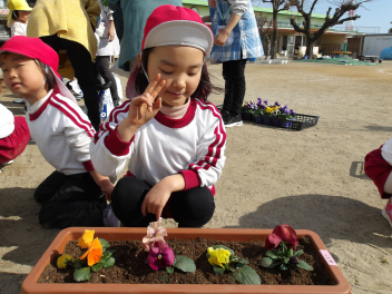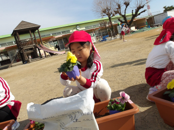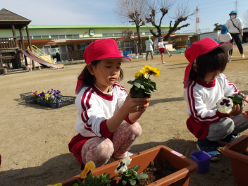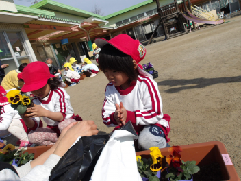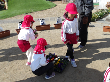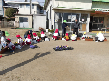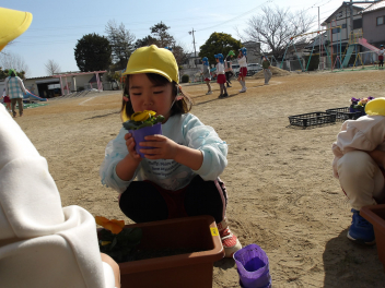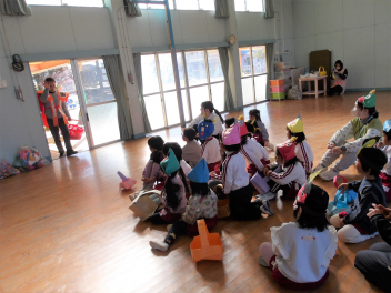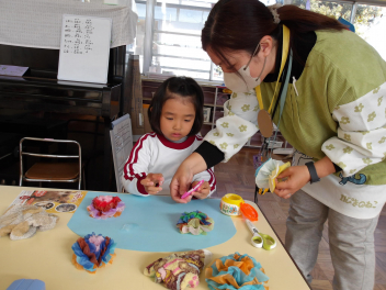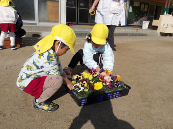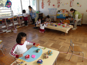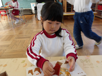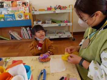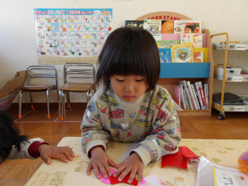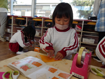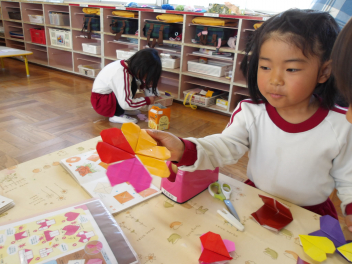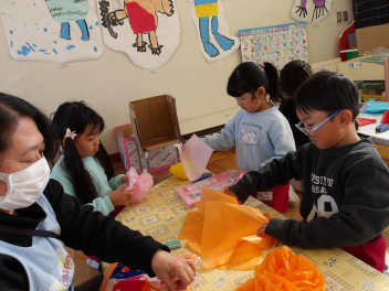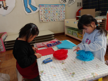 年中組のこどもたちは、折り紙を折ったり、お花紙で花を作ったりしていました。