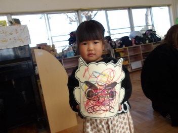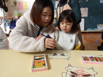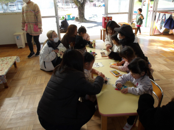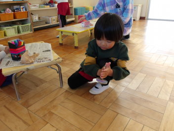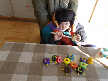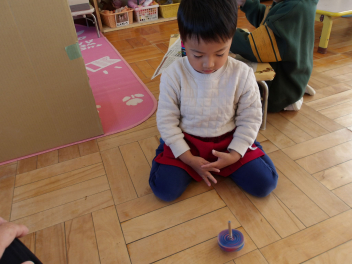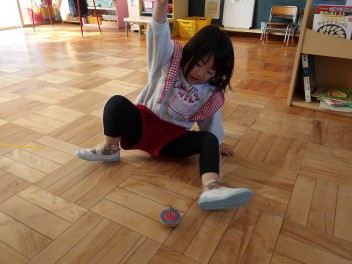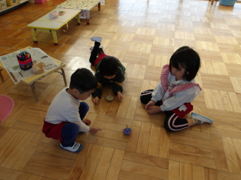年少組の3人は、生活発表会でもらったコマに色を塗ったり、回して遊んだりしていました。