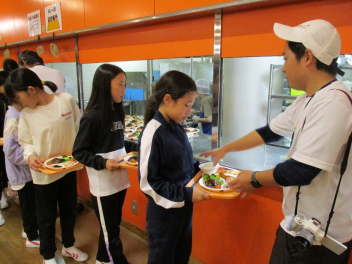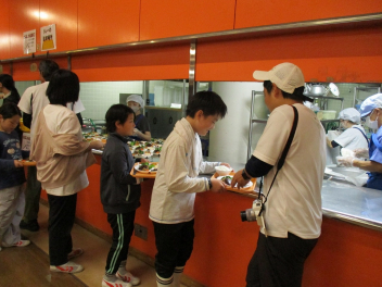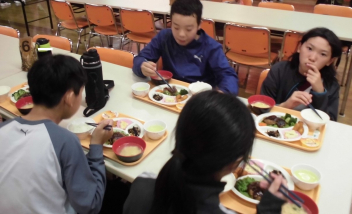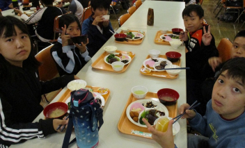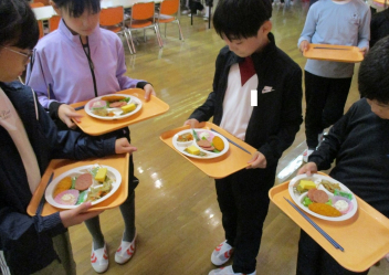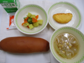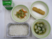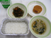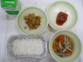 今日の主食は、白米に麦を混ぜて炊いた「麦ごはん」です。白いご飯の粒の中に、茶色い線が入った麦が混ざっているのがわかりますか。麦は、白米よりもたんぱく質やビタミン、食物せんいが多く含まれています。お米とは違った食感も特徴です。