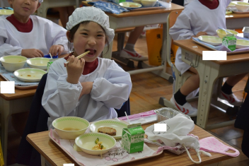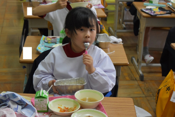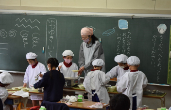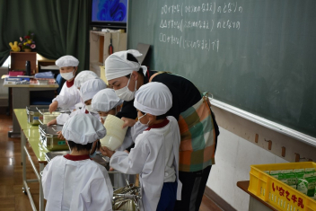 先生と一緒に配膳をして、おいしい給食を食べました。