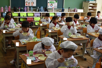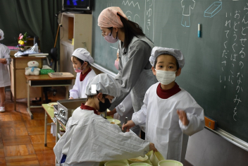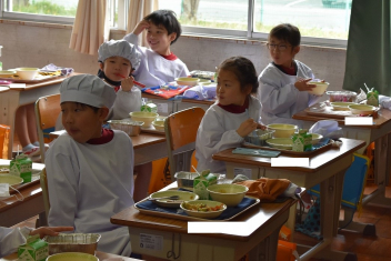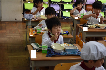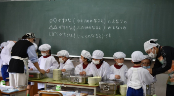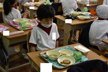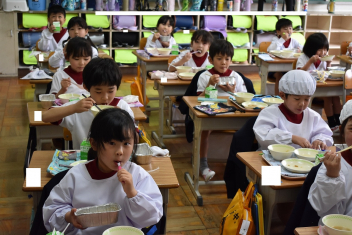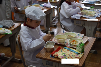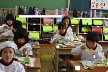 • 1年生にとって、小学校はじめての給食日。