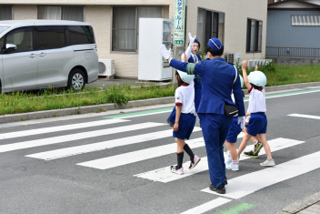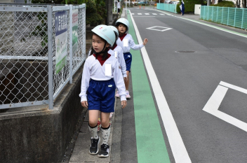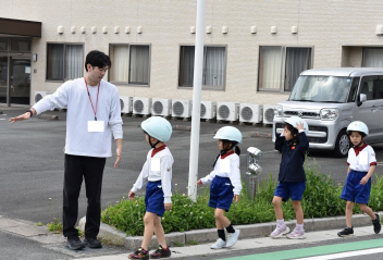 横断歩道を安全に渡る方法をみんなで実際に行い、確認しました。