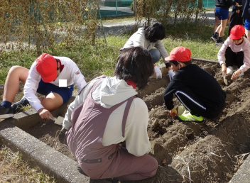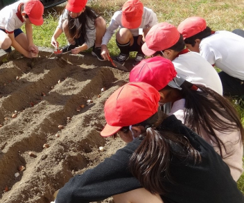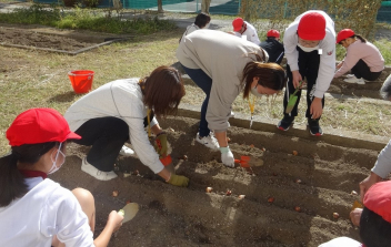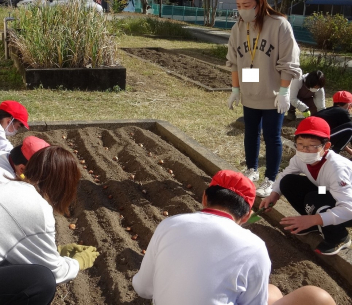 • 園芸委員会の子供たちは、花壇整備ボランティアの皆様と一緒に、チューリップの球根を植えました。