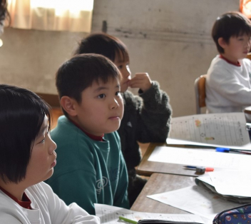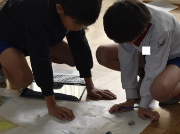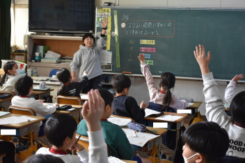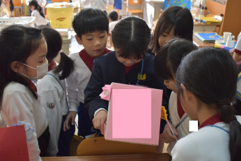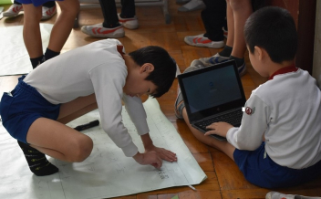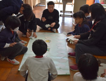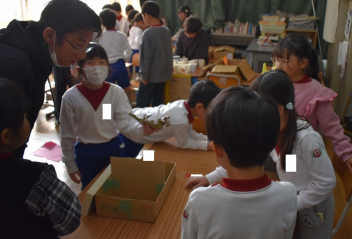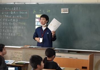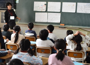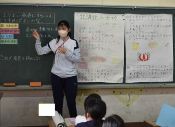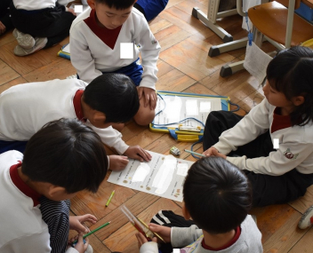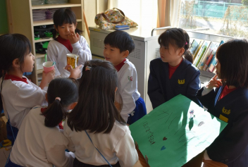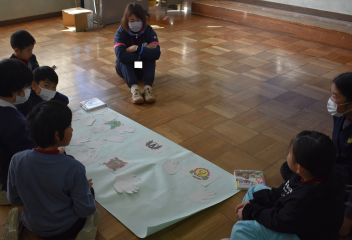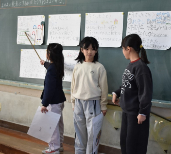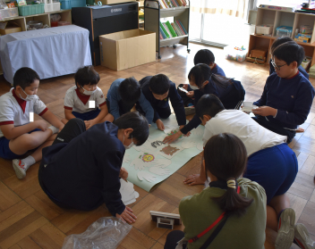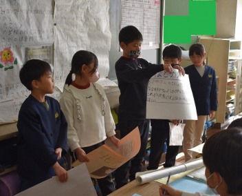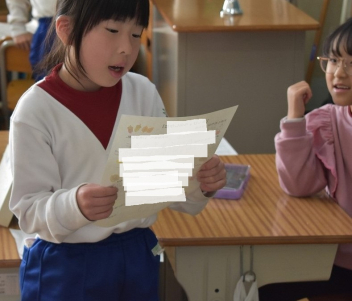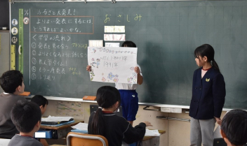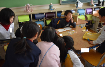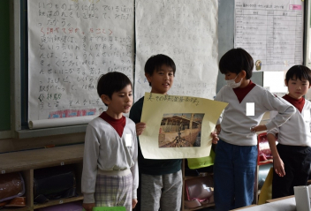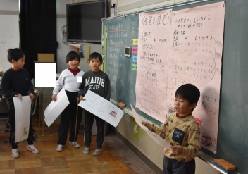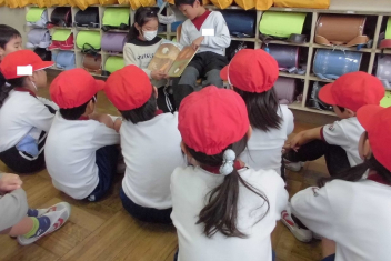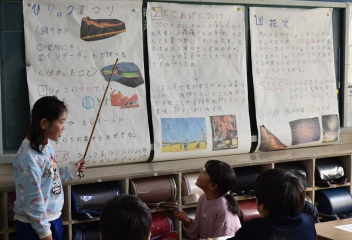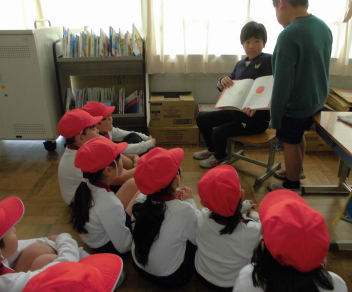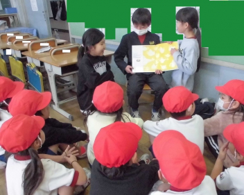 • 美薗学習で学習したことをまとめ、発表する姿。読み聞かせを1年生にする姿。