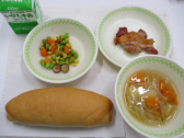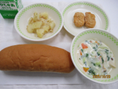 じゃがいもには、みかんと同じくらいの量のビタミンCが含まれています。ビタミンCは、熱に弱く、加熱すると半分ぐらいが壊れてしまいます。しかし、いも類に含まれるビタミンCは、でん粉に包まれているため、熱に強く、加熱しても壊れずに残ります。今日は、こふきいもにしました。