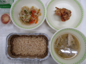 今日は、北浜東部中学校のリクエスト給食で、タイトルは、「パワーアップ給食」です。主菜の鶏肉のから揚げには鶏肉、汁物の豚汁には豚肉と、肉をたっぷりと盛り込んだ献立を考えてくれました。豚汁には、今が旬のごぼうを取り入れています。