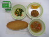 今日は、「ふるさと給食献立」・「浜松パワーフード給食」です。浜松産こまつなカレーコロッケには、浜松産のこまつな・たまねぎと、「夢の夢ポーク」というブランド豚を使っています。ベジタブルスープには、浜松産のセロリを取り入れ、デザートには、浜松産の白柳ネーブルを付けました。