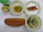 フランクフルトソーセージを長いパンで挟んだものをホットドッグと言います。ドイツ生まれのフランクフルトが、アメリカに伝わり、ホットドックが生まれました。給食では、食品添加物を控えたフランクフルトを使っているため、自然な色をしています。