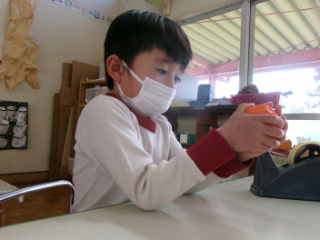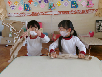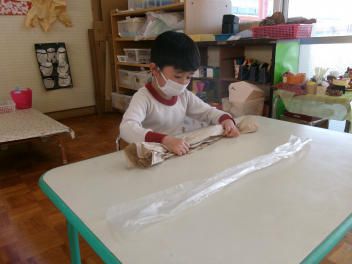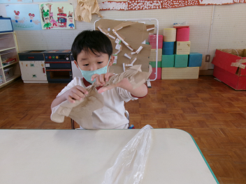 作ることが大好きなきりん組さんは、丸めたり、ねじったり、切ったり、貼ったりとっても楽しそうです。wink