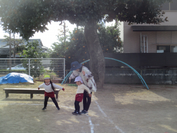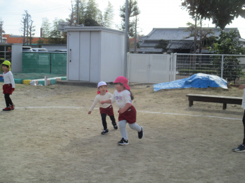寒さに負けない体つくりのために、朝から「なかよしタイム」で園庭を走ったり踊ったりして遊びましたよ。