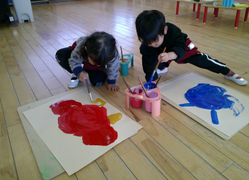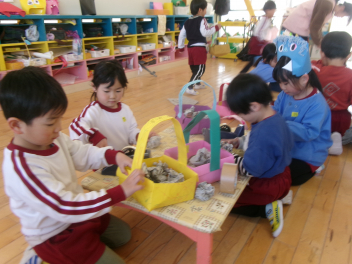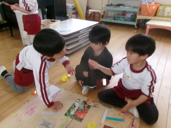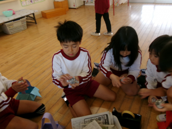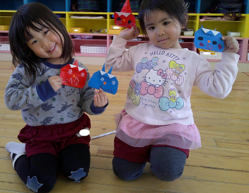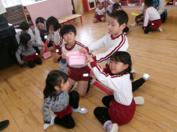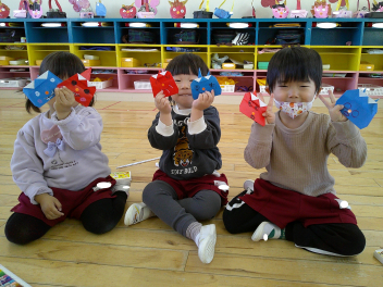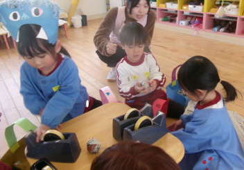 • 豆まきを前に、年長にじ組さんが、年少いちご組さんに角こう箱の作り方を教えてあげ、一緒につくりました。