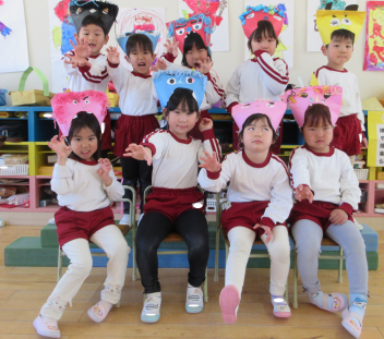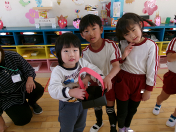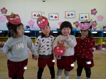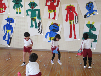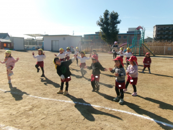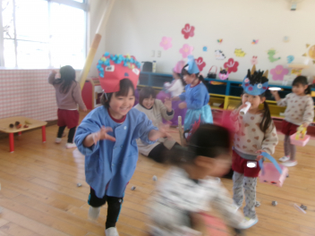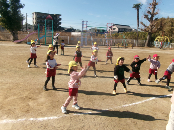朝は、みなみっこタイムで、年中ひまわり組さんと年少いちご組さんが、「赤鬼と青鬼のタンゴ」を踊ったり、しっぽ取りをしたりして、たくさん体を動かして遊びました。