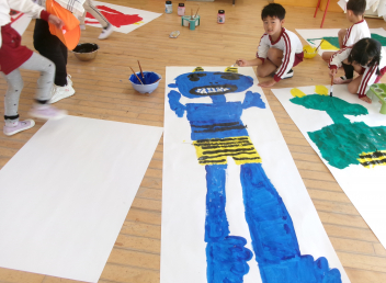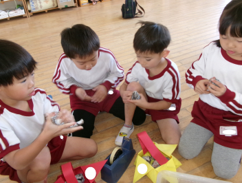 午後には、ひまわり組さんと年少いちご組さんと何かを作り始めました。