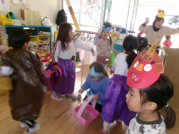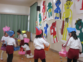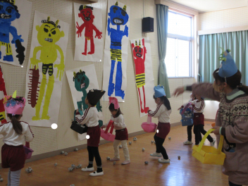 いちご組さんは、「おなかのなかにおにがいる」の絵本を見た後、お部屋で豆まきをしました。