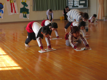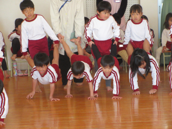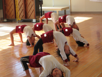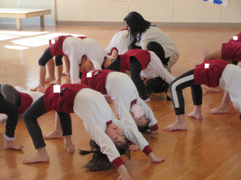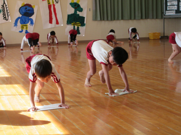 かめ(ブリッジも含む)、手押し車、二人スキップ、きょうだいすずめ、五色の玉を行いましたが、一つ一つ気持ちを込めて行いました。