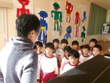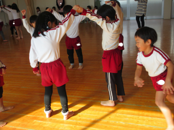 二人スキップでは、友達と気持ちを合わせてスキップしたり止まったり・・・ピアノの音もしっかり聞いていました。