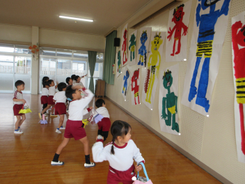 いつも通り、ピアノに合わせて雑巾がけから始めましたが、年長にじ組さんは最後のリズムということもあり、いつもより力が入っていたように見えました。