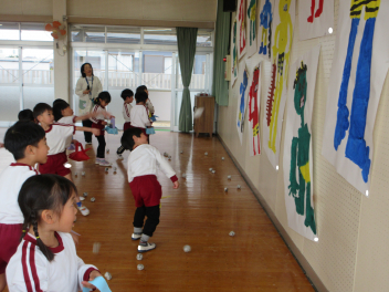 続いて、自分の中にいる鬼を追い出そうと、友達と豆をぶつけ合いました。