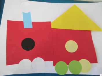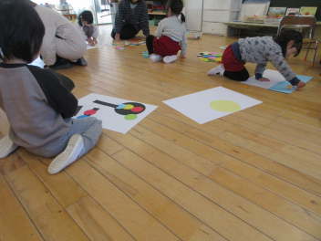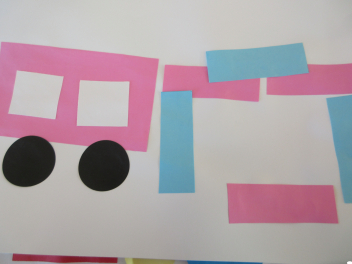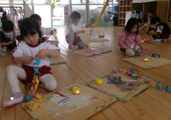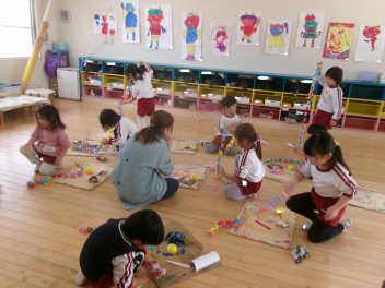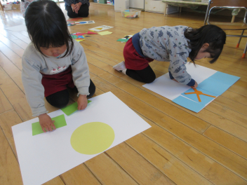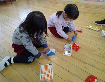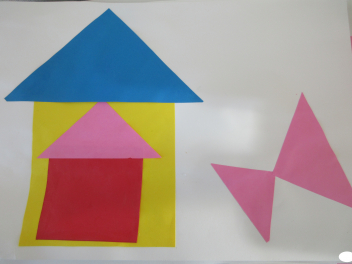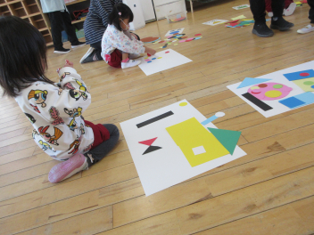 年少いちご組の部屋では、○や△、□などの形を組み合わせて、何かを作っていました。