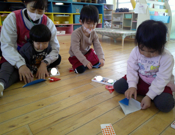 いちご組さんのものができたら、今度は自分のものを作ります。折り方も覚えていて、自分でどんどん作っていきます。途中わからないところや、一人でうまくできないところは助け合っていました。