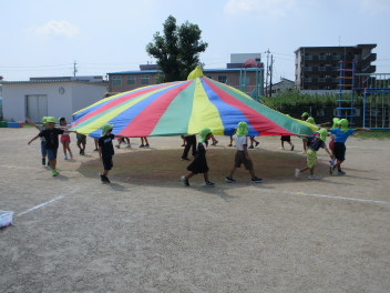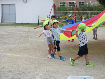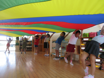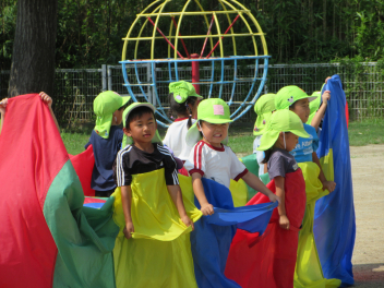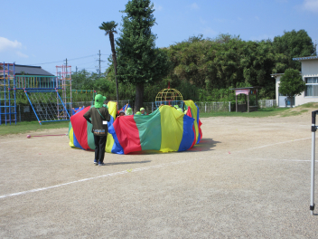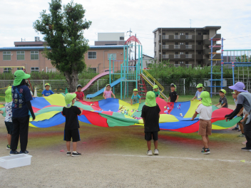 にじ組さんのパラバルーンには、いちご組さんとひまわり組さんも参加し、元気にトンネルをくぐりました。