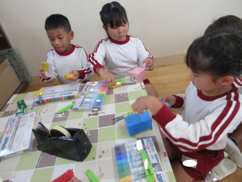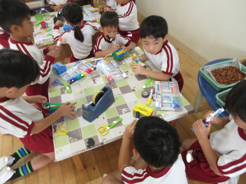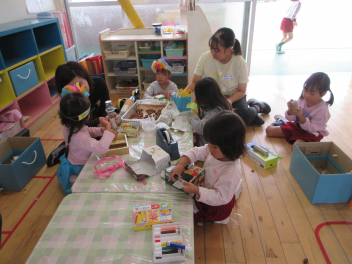 年少いちご組さんは、アイドルごっこや自然物(ドングリ)を使ってごっこ遊びに必要なマラカスなど作って遊びました。
