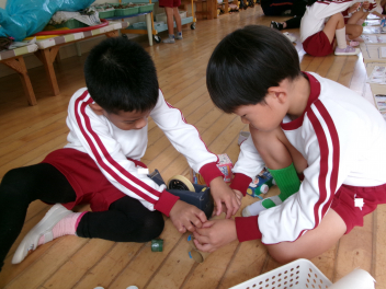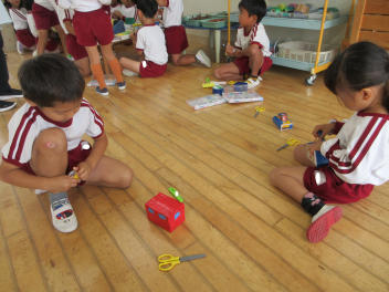 車を修理したり新しく作り直したりする子がいると、友達が様子を見て手伝っていました。