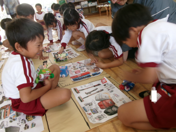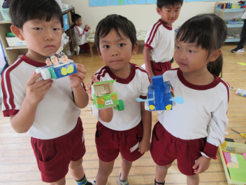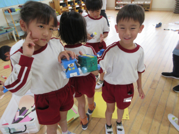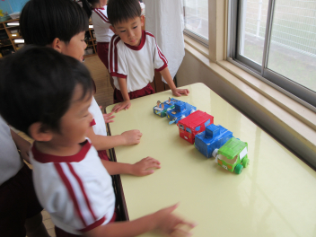 年長にじ組さんでは、先日完成したマップや車を使いお買い物が始まりました。自分の車で好きなお店に出掛け、買い物のやりとりを楽しみました。
