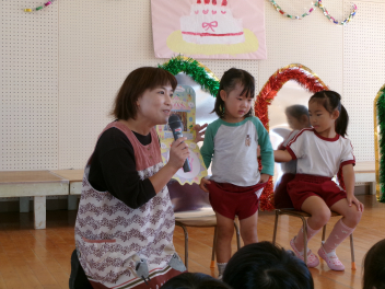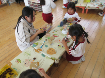 年中ひまわり組さんは、楽器のリズム打ちや自然物(ドングリ)を使ってケーキ作りをしたりして遊びました。