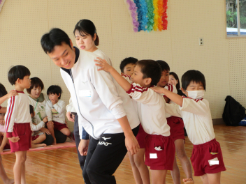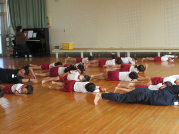 子供たちの動きを見ながら学校の先生たちも一緒に体を動かしてもらいました。