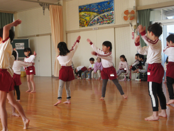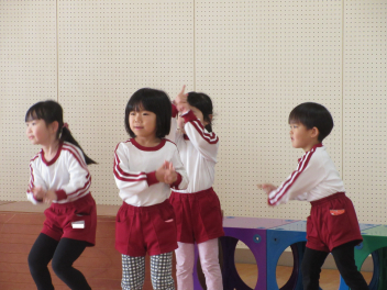 • 今日はリズムの日、朝冷えて、遊戯室の床が冷たかったけれど、ピアノのリズムに合わせて体を動かしたら、ポカポカしてきました。
