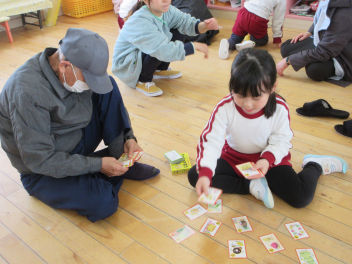 カルタ取りでは、おじいちゃんおばあちゃんに負けないように、たくさん札を取っていました。