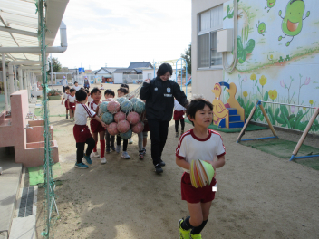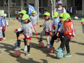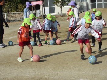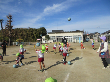 初めに、ボールを使った鬼ごっこや、高く上げたボールをキャッチしてボールに親しみました。
