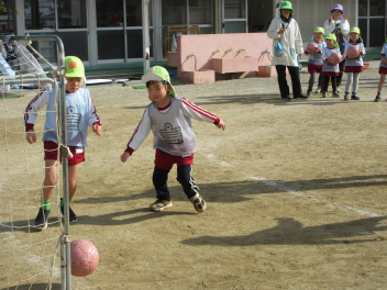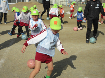 次に手を使わず、足でボールを移動させることに挑戦。ボールを蹴ると、思っていたところにボールが動かず悪戦苦闘。でも、根気よくボールを運びました。ボール運びに慣れたら、シュートに挑戦し、勢いよくゴールネットを揺らしている子もいました。