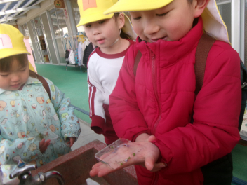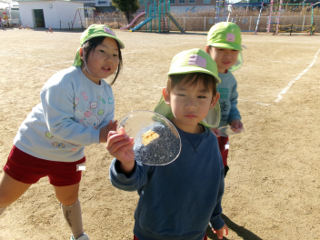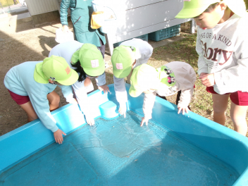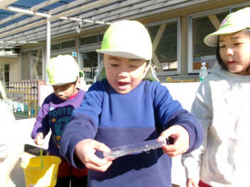 氷が張っていると、氷取りが始まりました。と取った氷は、年中ひまわり組さんや年少いちご組さんにも見せてあげました。