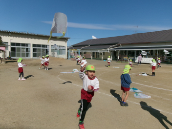 氷取りを楽しんだ後は、自分たちで作った凧をあげて、園庭をたくさん走りました。