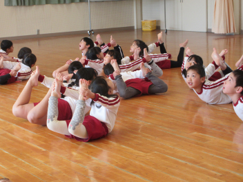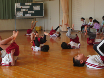 かめ(ブリッジも含む)、手押し車、二人スキップ、きょうだいすずめ、五色の玉を行いましたが、一つ一つ気持ちを込めて行いました。