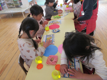 年少いちご組さんは、自分の選んだ好きな色の顔に目や鼻、角などを貼っていきました。