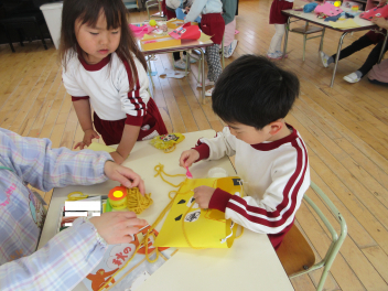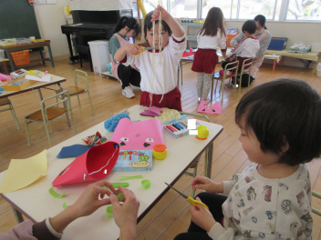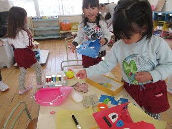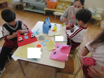 • 豆まきを前に、年長にじ組さんが、年少いちご組さんに角こう箱の作り方を教えてあげ、一緒につくりました。