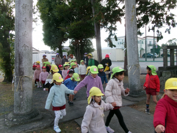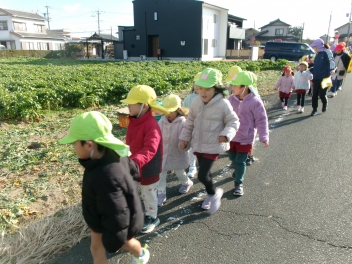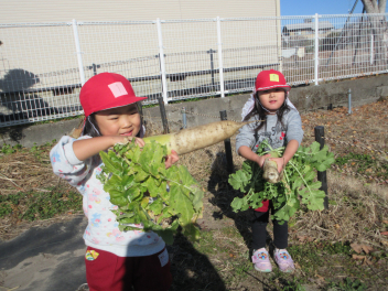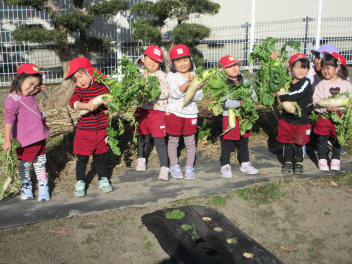 体が暖かくなった年少いちご組さんは、畑の大根掘りをしました。