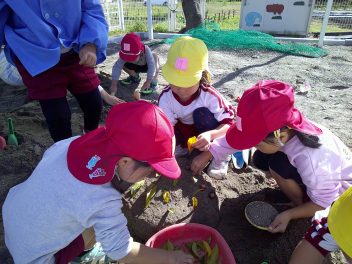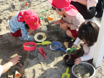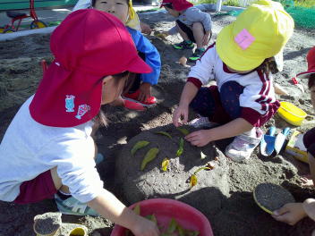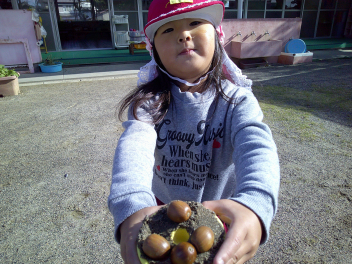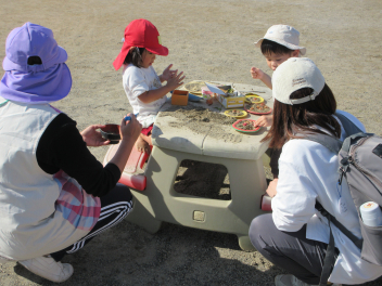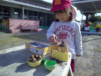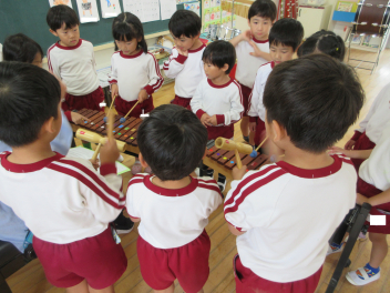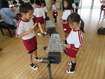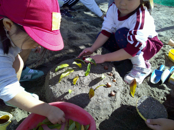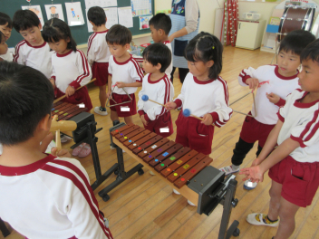 年中ひまわり組さんは、楽器のリズム打ちや自然物(ドングリ)を使ってケーキ作りをしたりして遊びました。