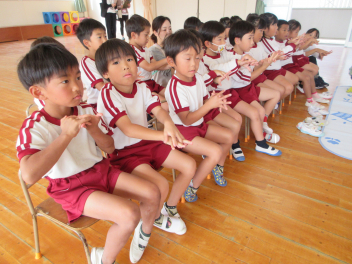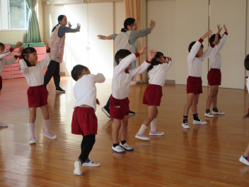 子供たちの動きを見ながら学校の先生たちも一緒に体を動かしてもらいました。