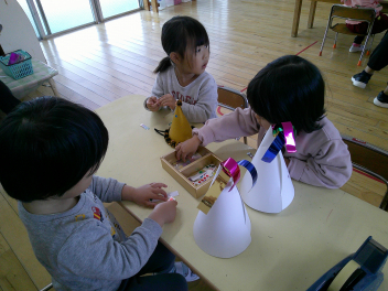 年少いちご組さんは、アイドルごっこや自然物(ドングリ)を使ってごっこ遊びに必要なマラカスなど作って遊びました。