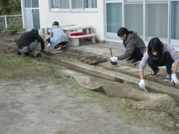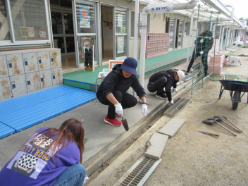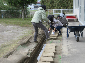 車を修理したり新しく作り直したりする子がいると、友達が様子を見て手伝っていました。