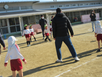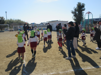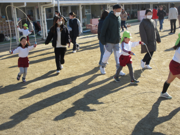 • 先週できなかった年長にじ組さんの参観会を行い、おうちの方と一緒にたくさん体を動かして遊びました。