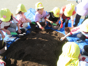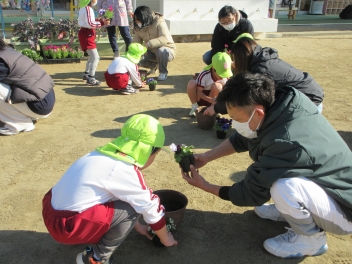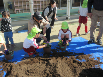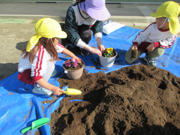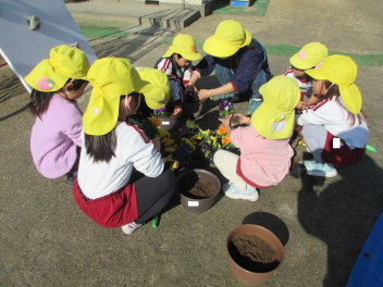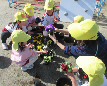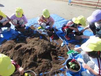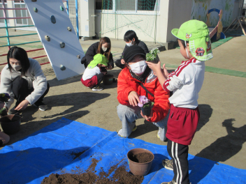 ひまわり組さんも自分の植木鉢にお花を植えました。