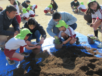 ドッジボールの後は、好きな花を選んで親子で寄せ植えをしました。