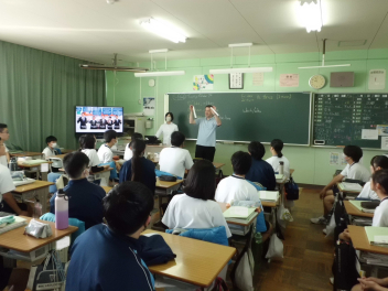 ALTのブライアン先生は、週に3日本校に来て、各クラスの英語の授業に参加してくれます。
